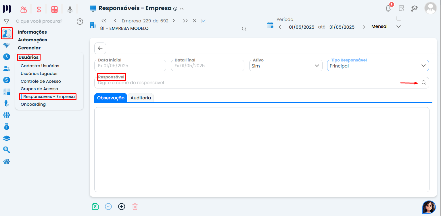 Passo 3: Após verificar o cadastro do usuário, vá até a aba Responsáveis – Empresa dentro da seção Usuários.