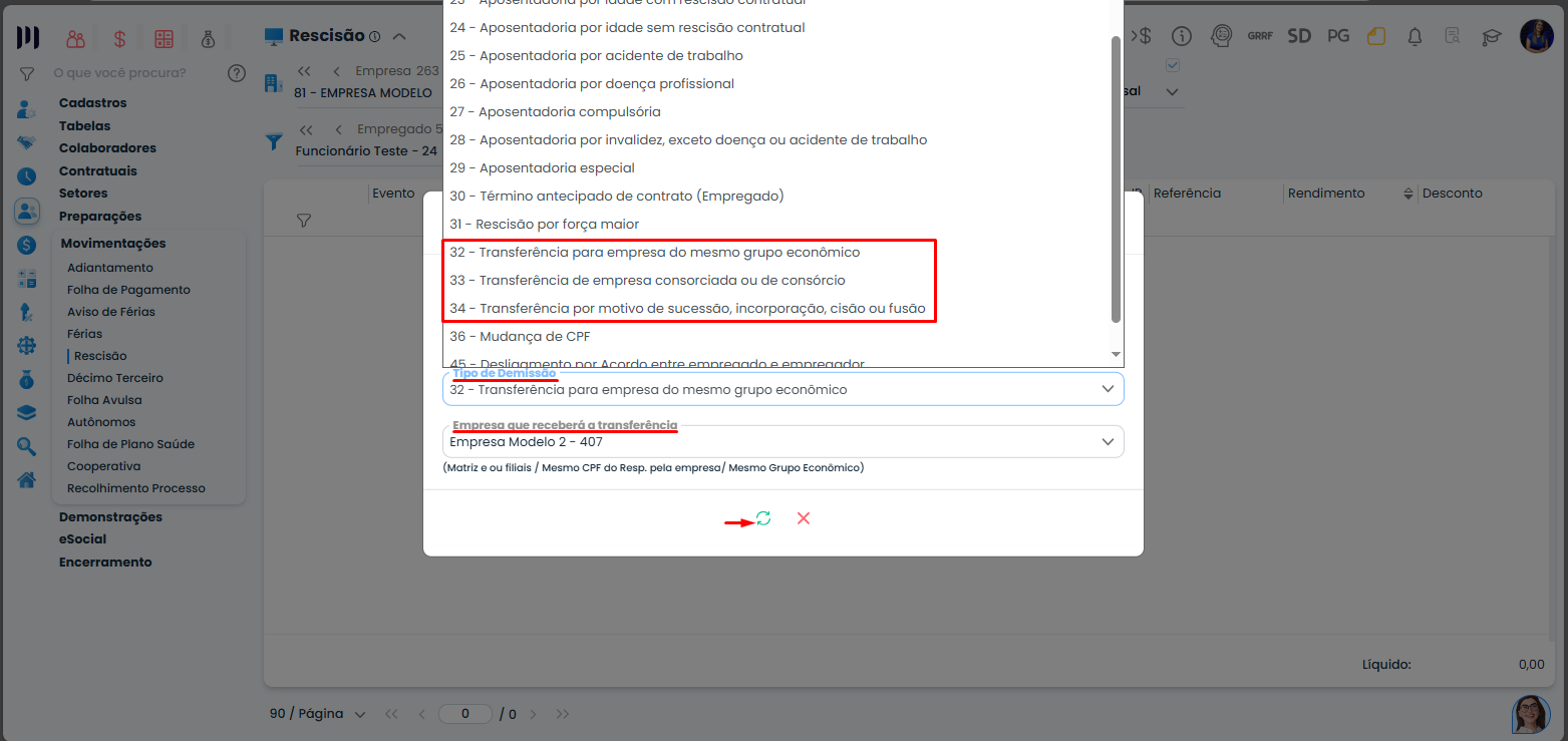 • No campo Tipo de demissão, selecione o código correspondente à transferência: