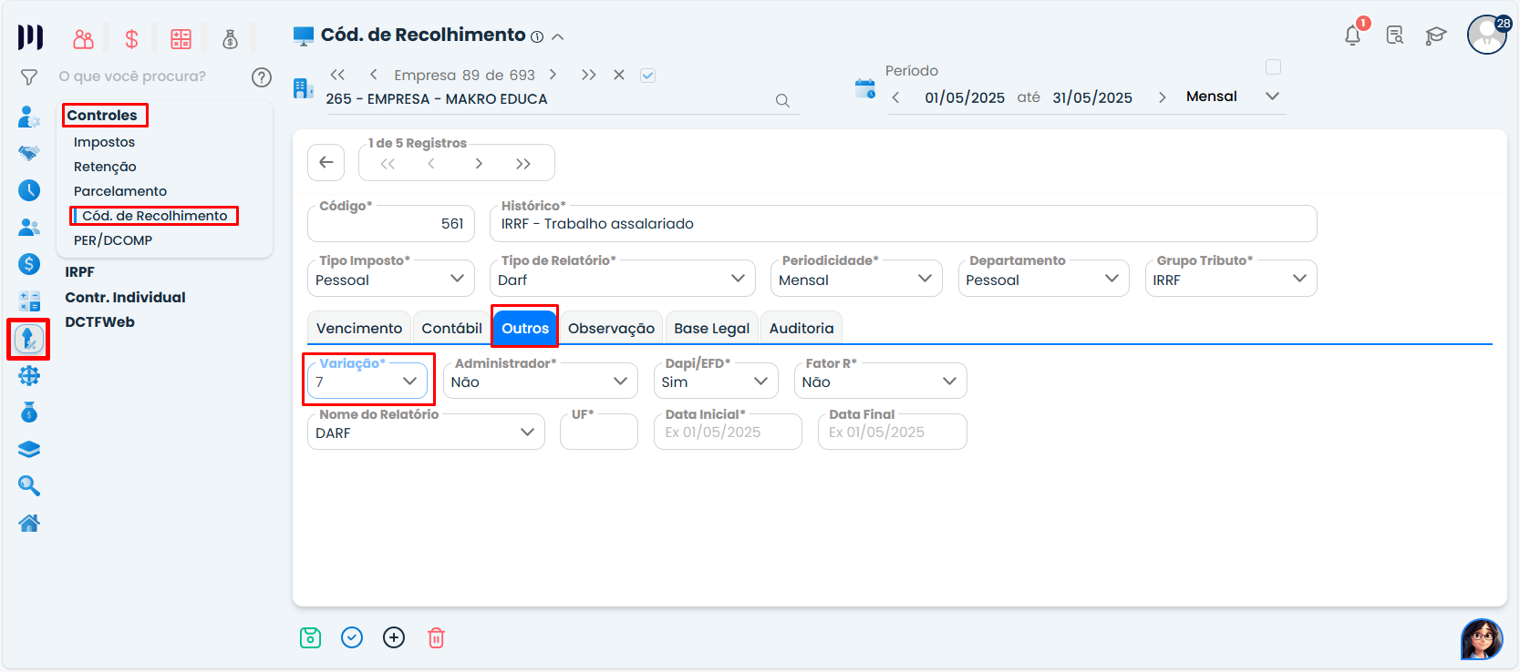 Esse erro costuma ocorrer quando a variação do código de recolhimento está incorreta, especialmente para guias anteriores a maio de 2023. Para o sistema permitir a emissão correta da DARF, é necessário ajustar esse campo de forma adequada.