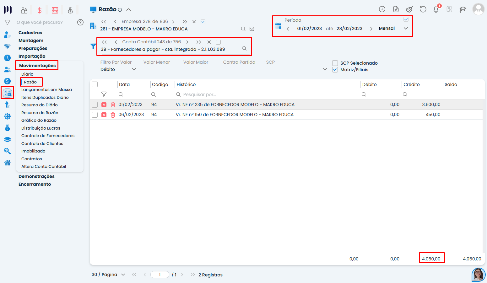 Passo 3: Verifique se o valor provisionado na conta Fornecedores a Pagar está em conformidade com o saldo registrado no módulo Contábil, acessando o caminho: Contábil > Movimentações > Razão.