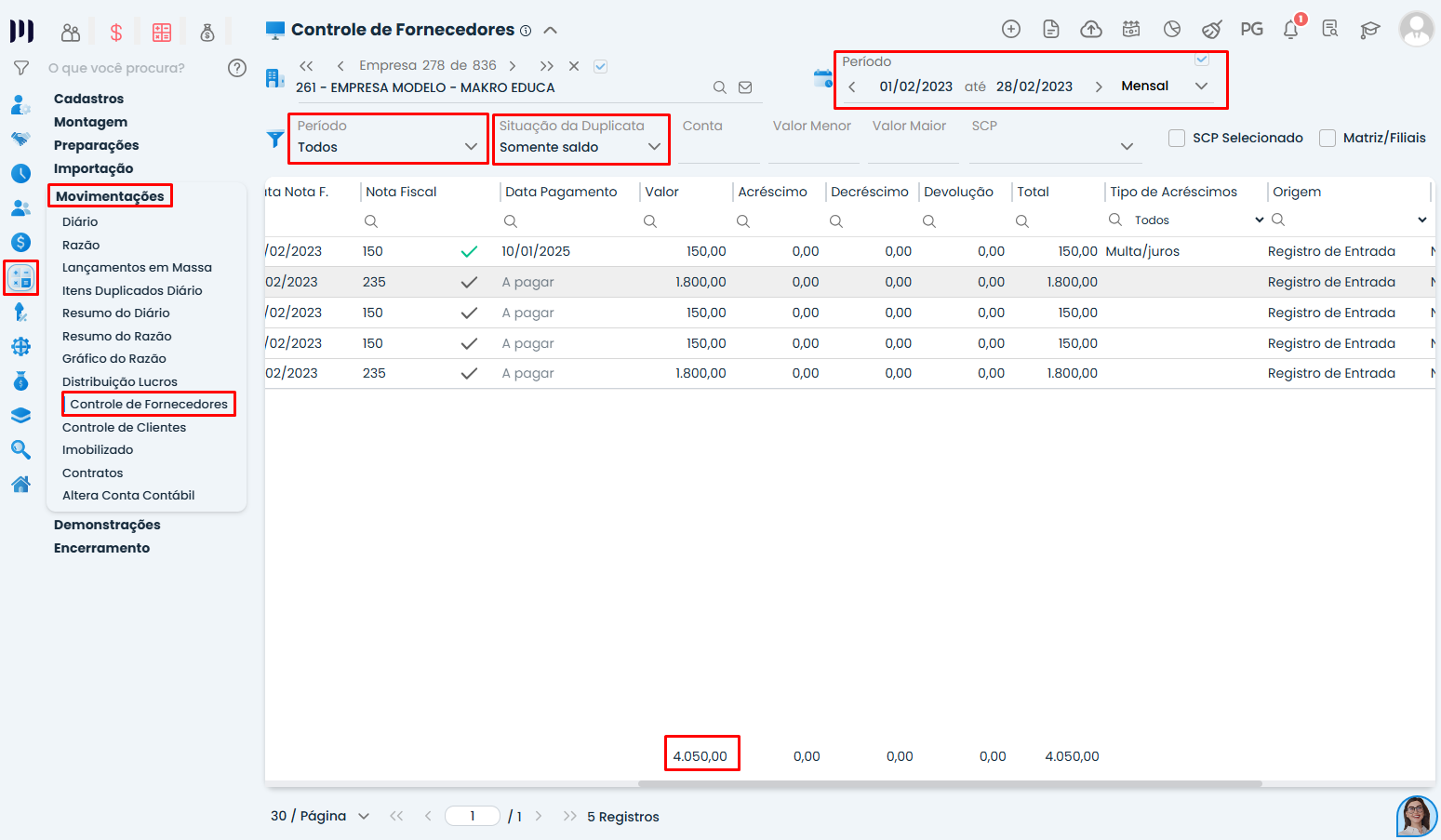Passo 4: A conferência do saldo entre o controle de fornecedores e a conta contábil Fornecedores a Pagar deve ser realizada por meio do caminho Contábil > Movimentações > Controle de Fornecedores.