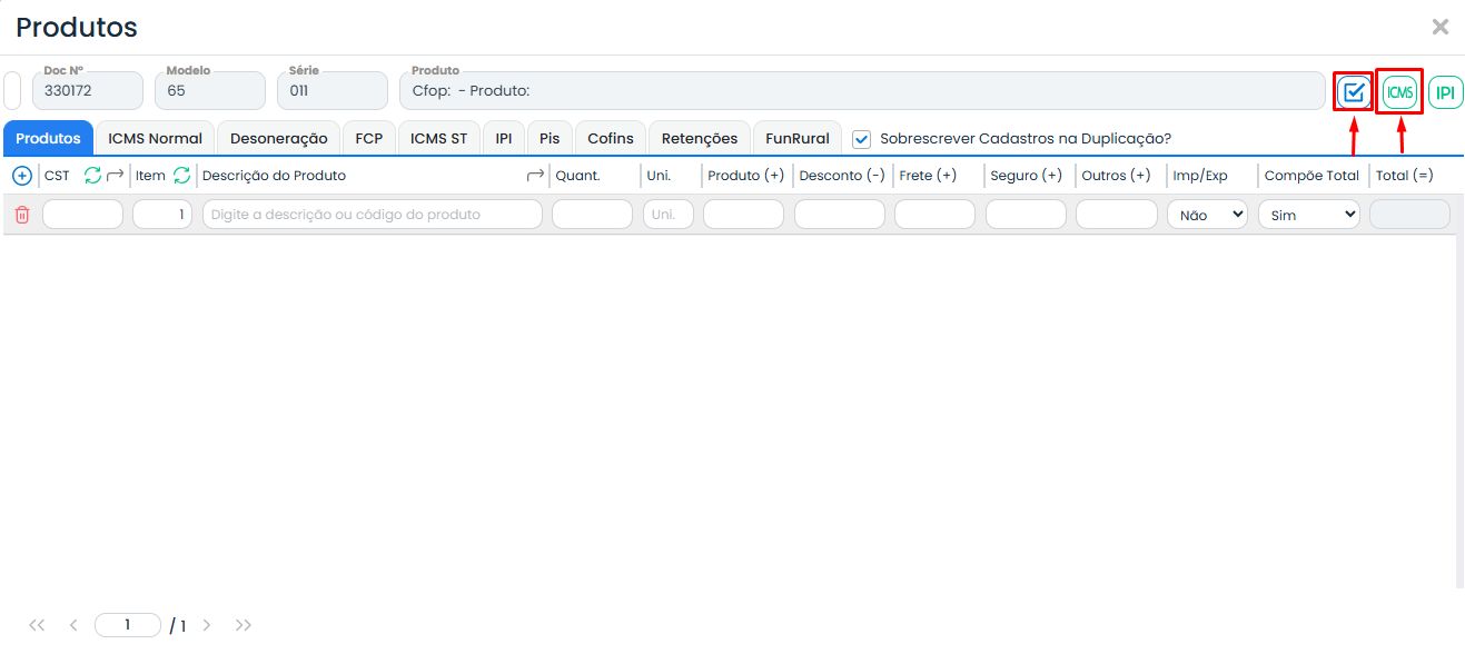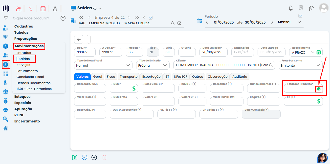 Modulo Fiscal > Movimentações > Saídas > No campo “Total de Produtos” selecione “Ir para opções de produtos”