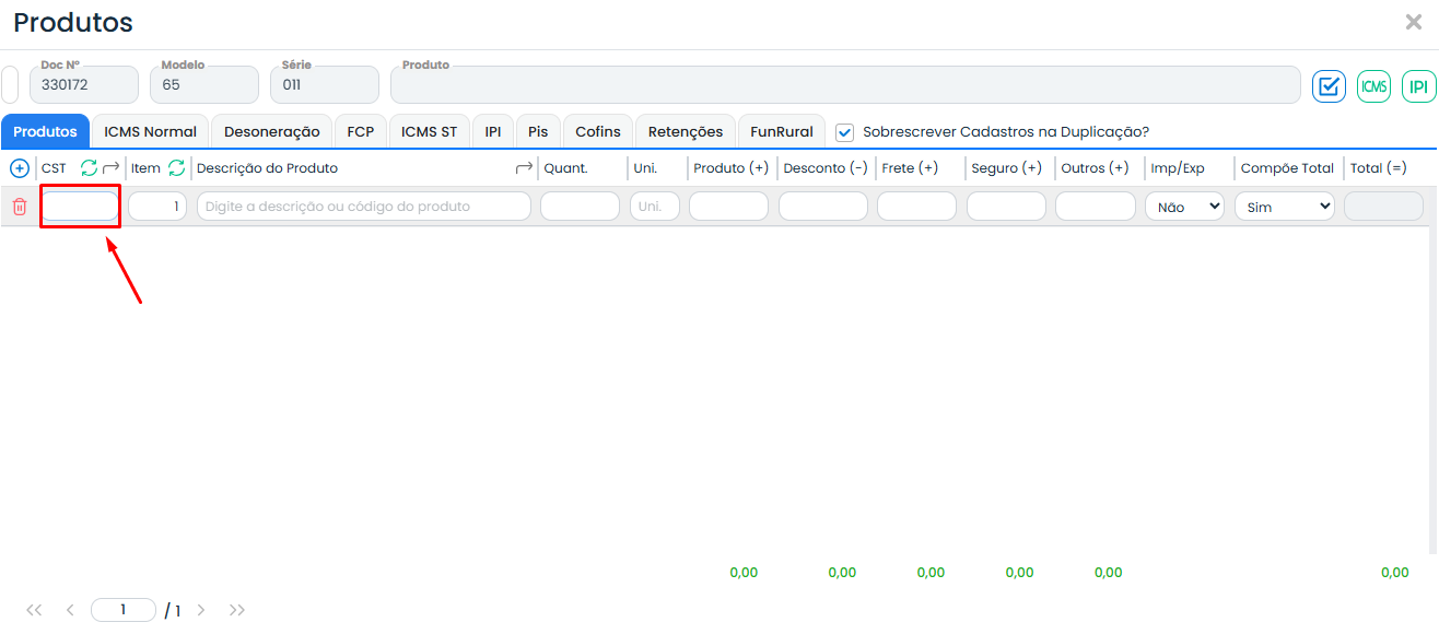 Preencha o campo “CST” com o código correto.