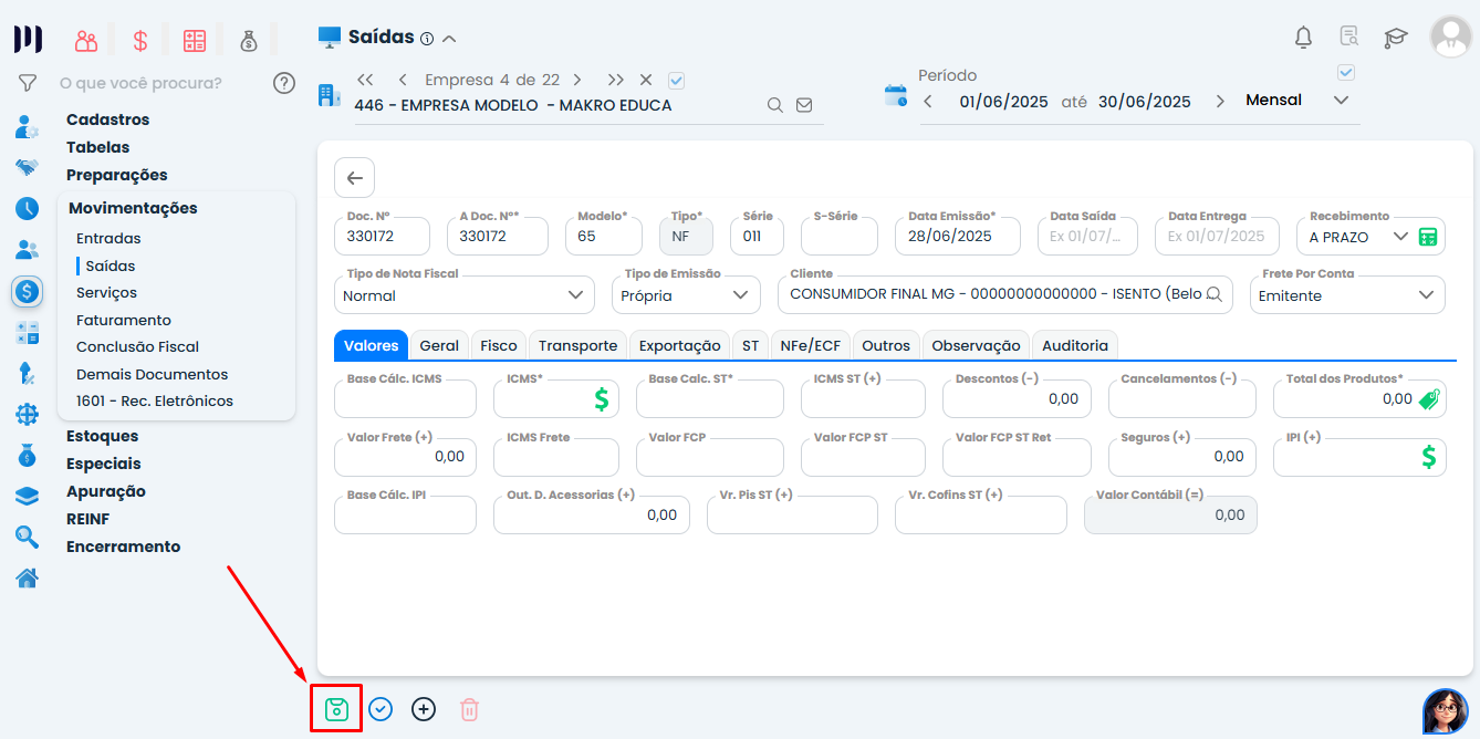 Salve a Nota Fiscal clicando em “Salvar”