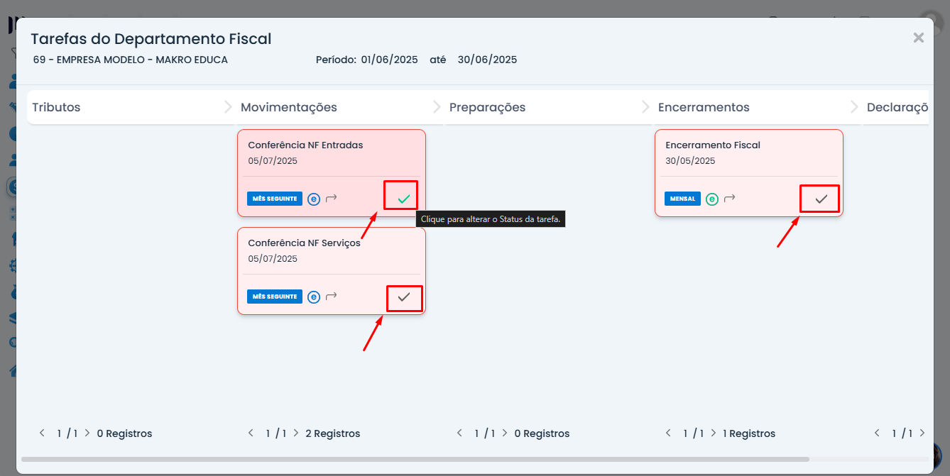 As tarefas pendentes serão destacadas em vermelho. Para prosseguir com a atualização, clique na opção “Clique para alterar status da tarefa”.