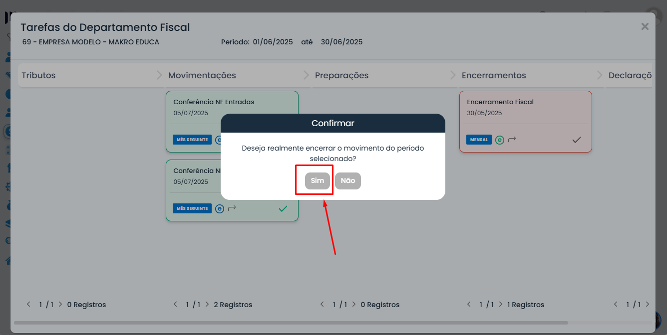 Ao selecionar a tarefa de encerramento fiscal, o sistema exibirá uma mensagem de confirmação solicitando a validação da ação. Para concluir o encerramento do movimento referente ao período selecionado, clique na opção “Sim”.