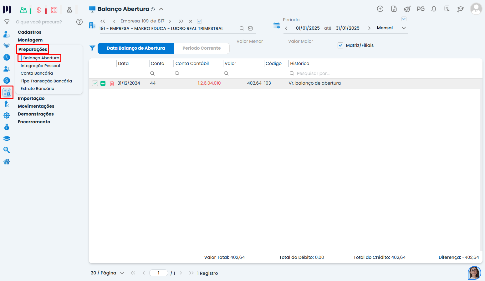 • A data de balanço de abertura deve ser sempre preenchida corretamente, sempre deve ser um dia anterior ao início das movimentações