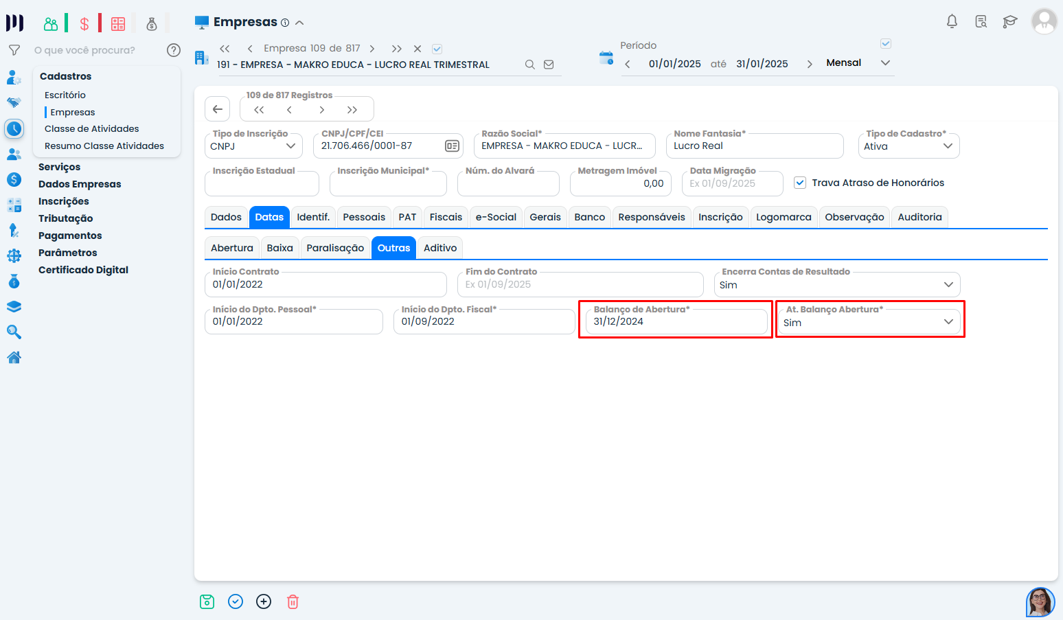 Se mesmo após esses passos o saldo não aparecer corretamente no balanço de abertura, acesse: Preparar > Cadastros > Empresas > Datas > Outras. Localize a opção “At. Balanço Abertura” e altere para “Sim”. Salve as alterações e salve também o cadastro do imobilizado, os dois cadastros realizados.