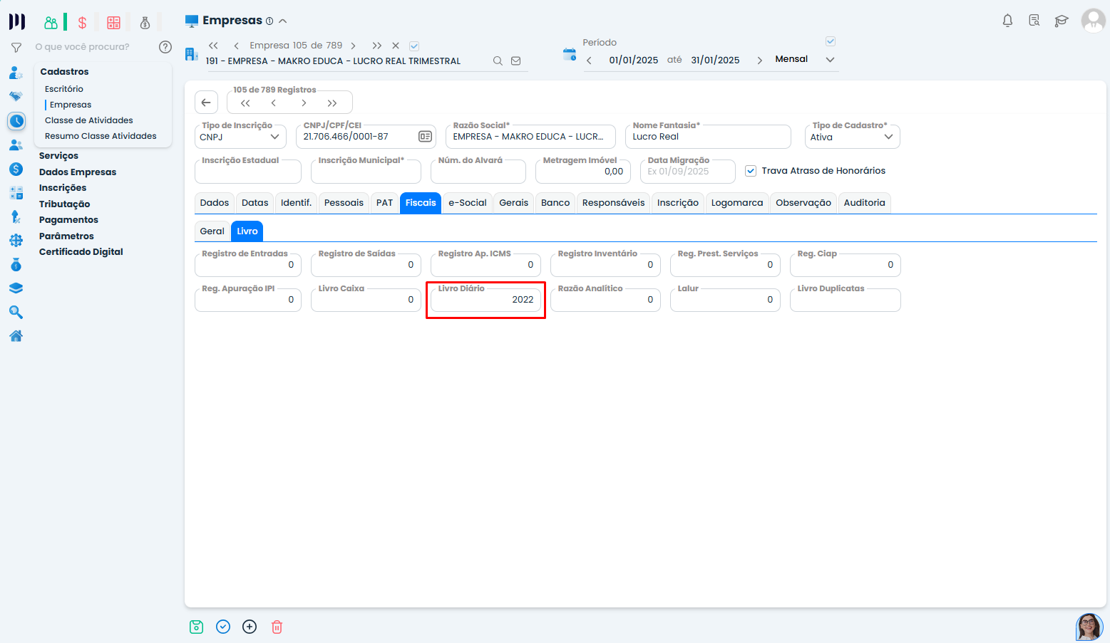 • No campo Livro Diário, informe o ano da primeira entrega realizada.