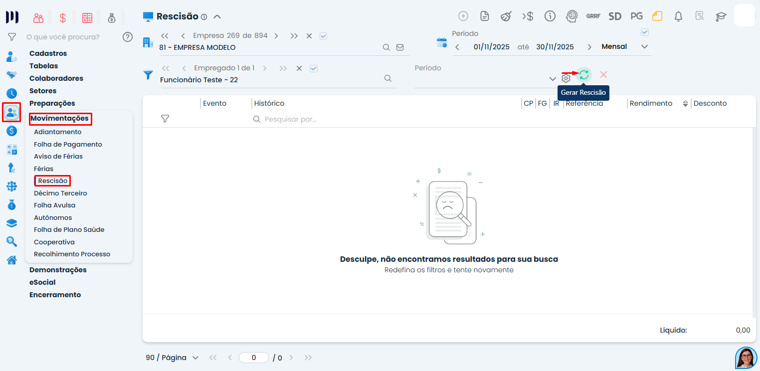 Passo 2: No menu Pessoal>Movimentação>Rescisão, clique no ícone ‘Gerar rescisão’;