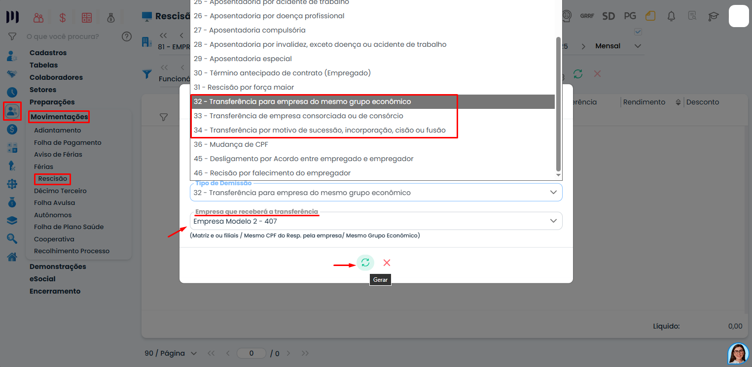 • No campo Tipo de demissão, selecione o código correspondente à transferência: