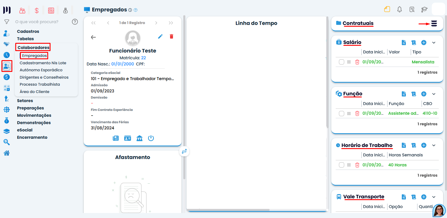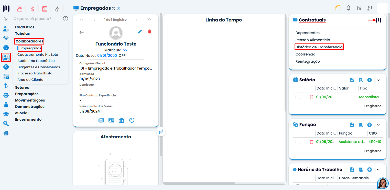 Na aba 'Empregados' da empresa de destino, acesse o menu Contratuais e confira informações obrigatórias como salário, função, jornada de trabalho, dependentes e últimas férias gozadas.