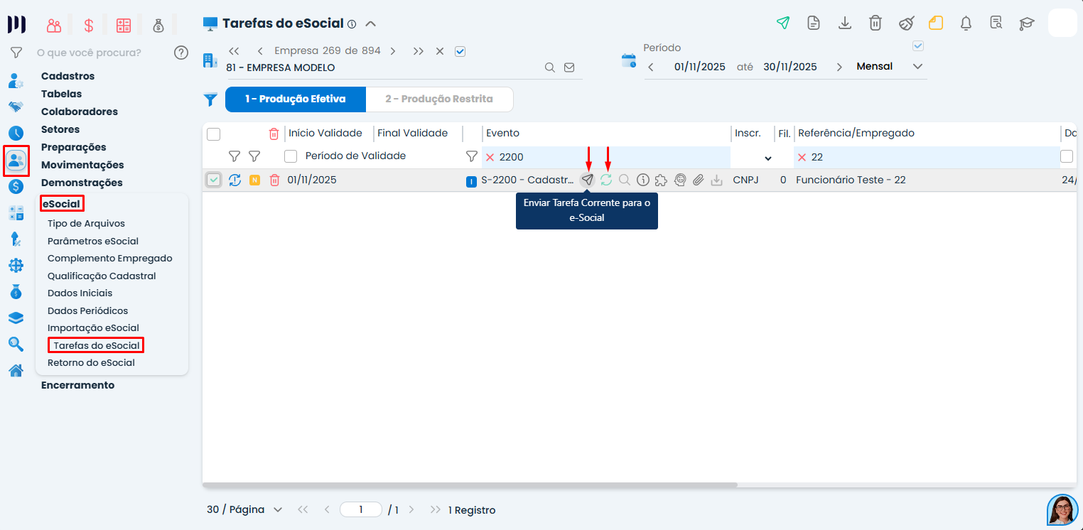 Passo 7: Acesse Pessoal>eSocial>Tarefas eSocial, envie o evento S-2200 (Admissão) referente a esse empregado;