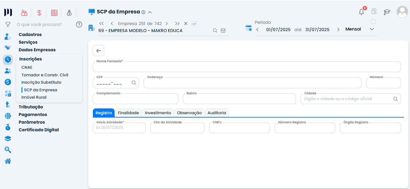 Clique em Incluir, preencha as informações de tributação específicas da SCP e salve.